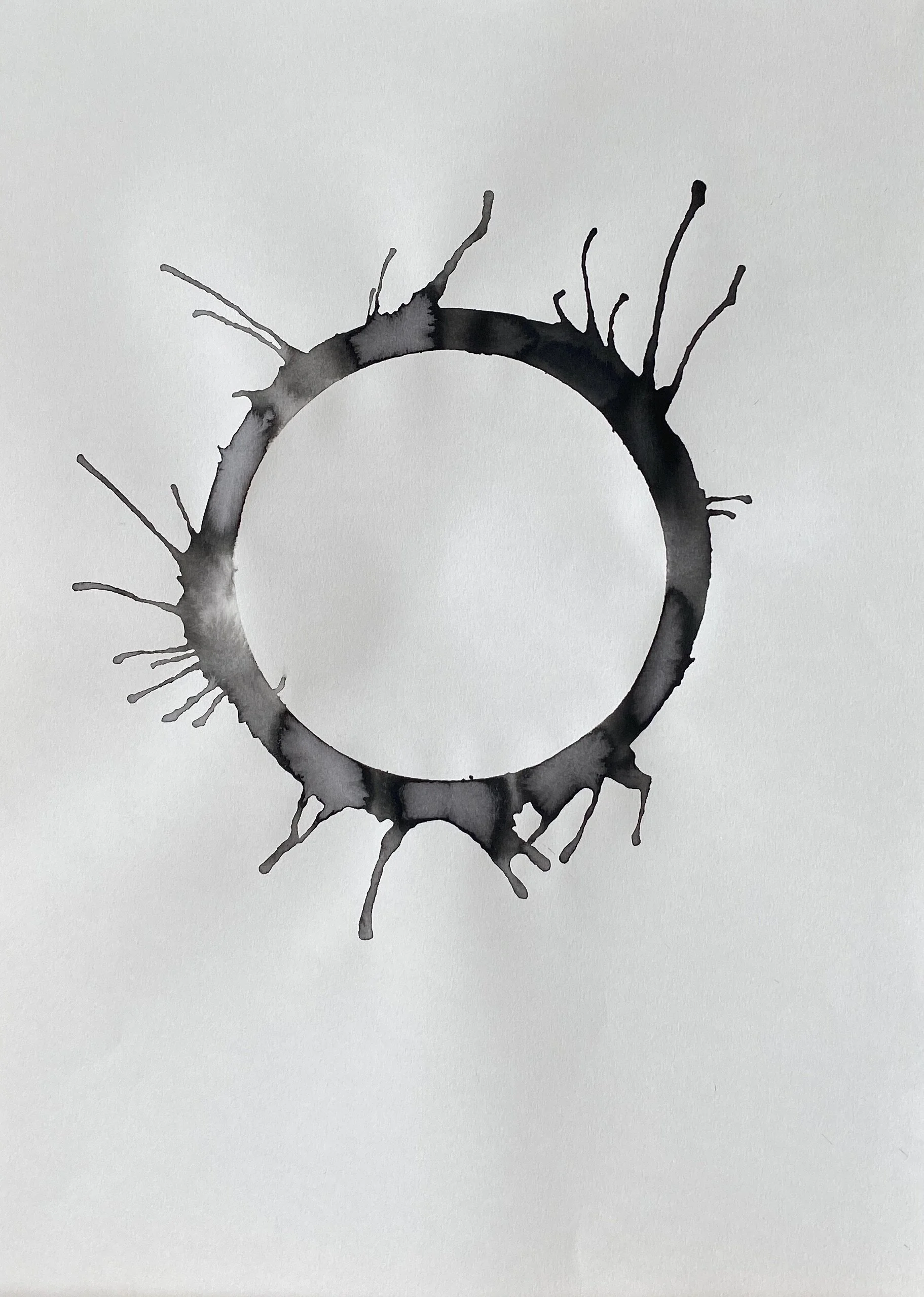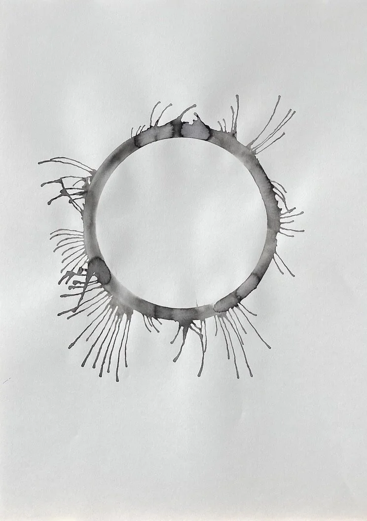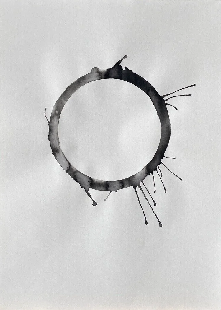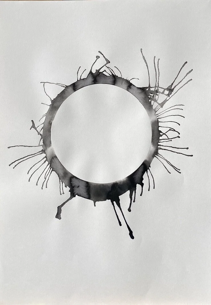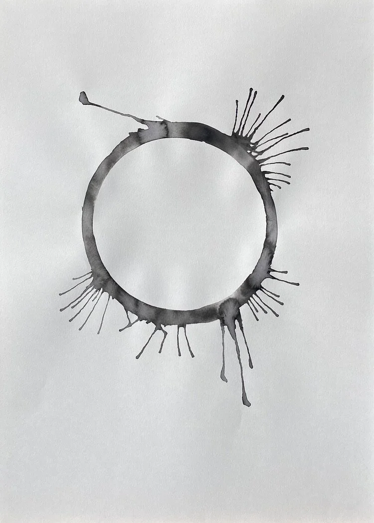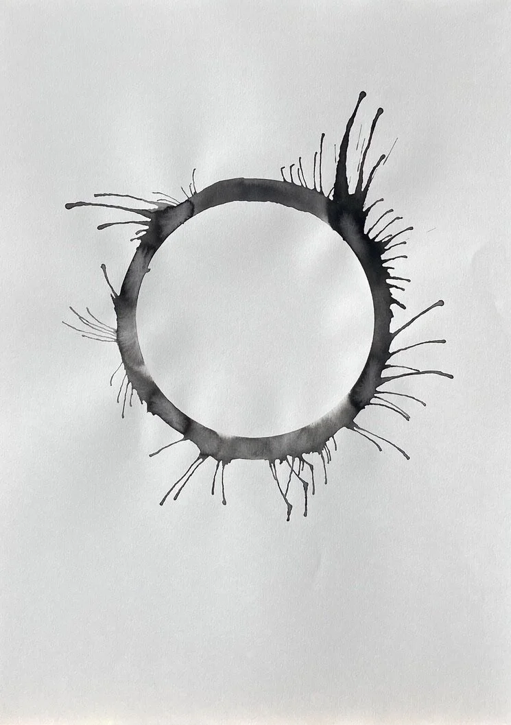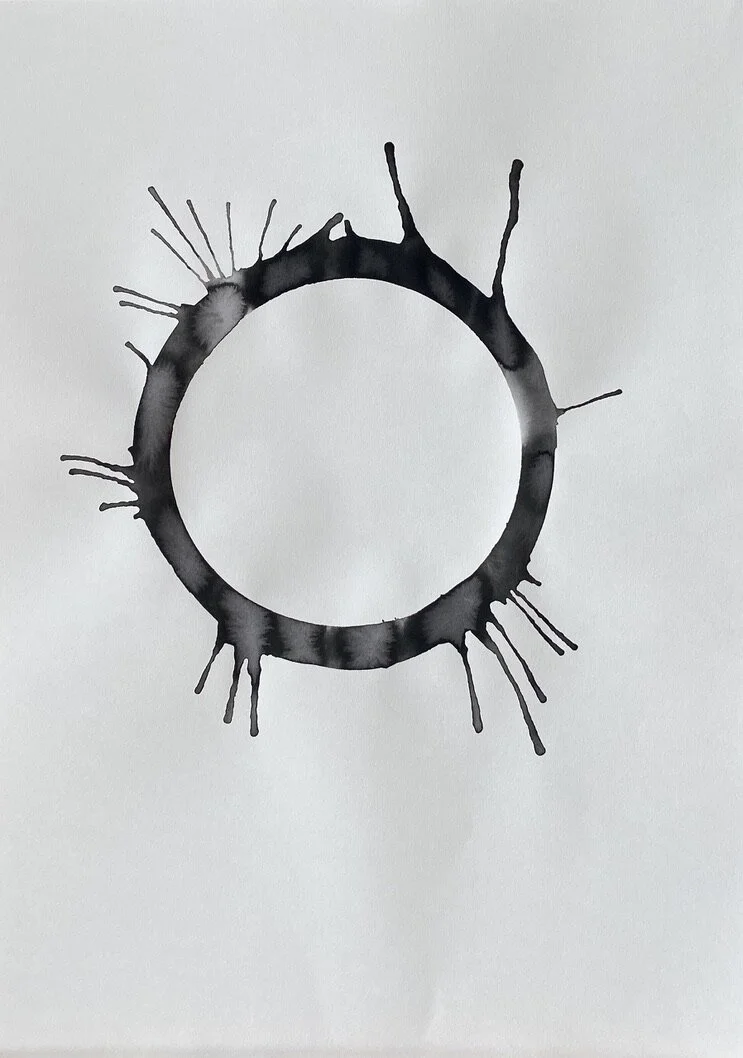 A sheet of paper is the conscious mind of the human life state. A ring of water is drawn onto the paper, representing the subconscious mind and the unseen or unknown self. Ink is loaded into the ring of water to symbolise an event or experience internalised as an inner demon - a presence locked in the subconscious beliefs system.
