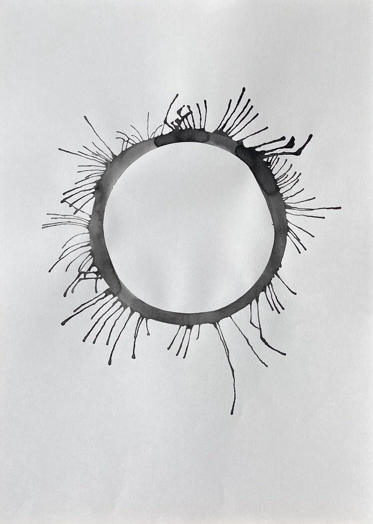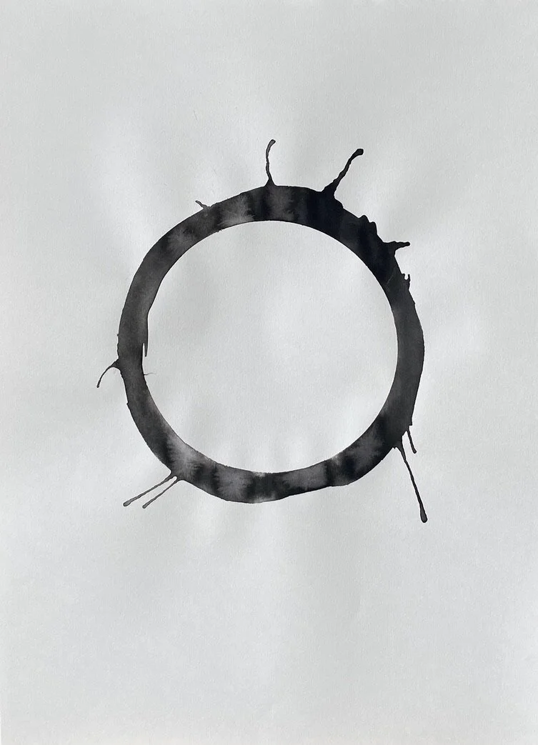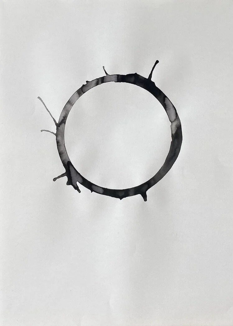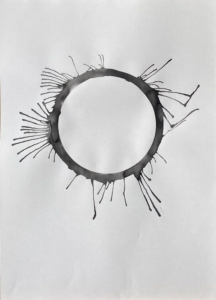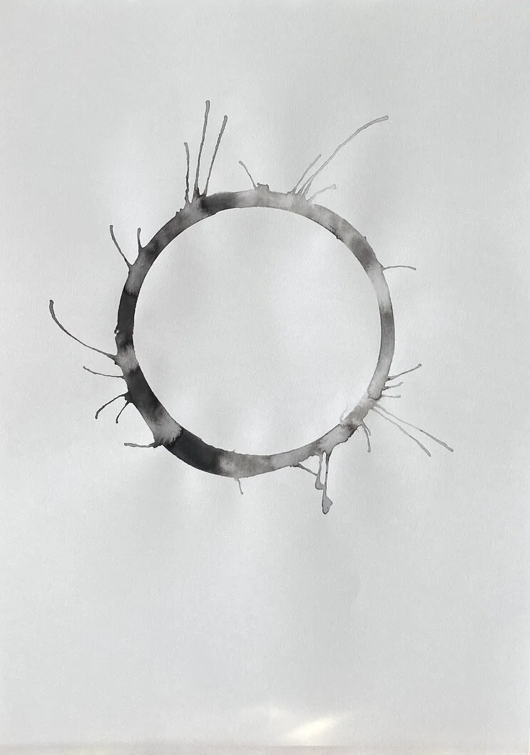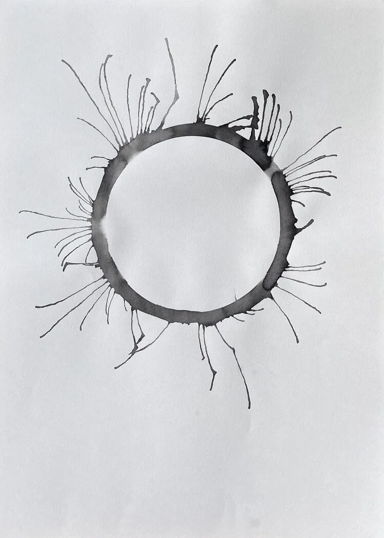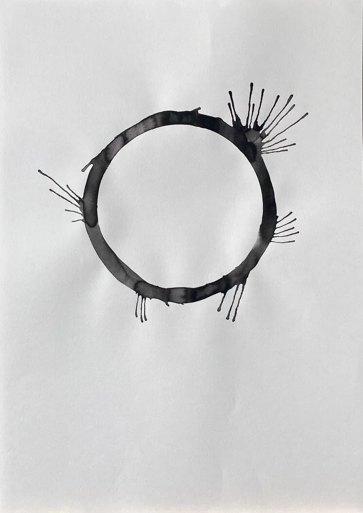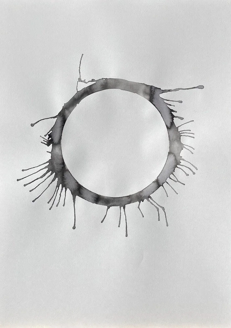 A sheet of paper is the conscious mind of the human life state. A ring of water is drawn onto the paper, representing the subconscious mind and the unseen or unknown self. Ink is loaded into the ring of water to symbolise an event or experience internalised as an inner demon - a presence locked in the subconscious beliefs system.
